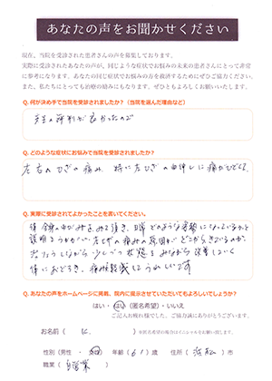 みなさんおはようございます!京都市山科区の渋谷街道沿いにあるじとう接骨院の院長、地當です。 膝の痛みでお悩みの患者さんから感想を頂きました。 61歳 女性 自営業 【膝痛】 Q.何が決め手で当院を受診されましたか?(当院を選んだ理由など) 先生の評判が良かったので Q.どのような症状にお悩みで当院を受診されましたか? 左右の膝の痛み、特に左膝を屈伸する時に痛みがひどくて Q.実際に受診されてよかったことを書いてく...