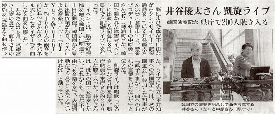 JUGEMテーマ:心、体、そして魂。 昨日、11月28日からのDJ Yuta & Yuichiプロジェクトでの初の海外公演であります、韓国江原道ツアーより帰還致しました。 今回は、当地で行われました『全国障がい者幸せ分かち合いフェスティバル』というイベントでの客演演奏というお話だったのですが、現地に到着してからご説明を受けたのですが、鳥取県から派遣されたのは我々だけ、しかも日本からの招待は鳥取県のみ、ということで、実質日本からの代表ということで、お招きを受けました。本当に光栄なことだと...