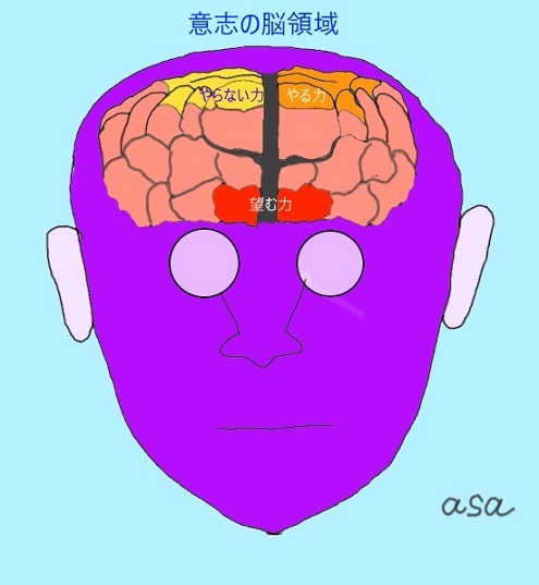 意志とは 1.あることをa行いたい、またはb行いたくないという考え、意向。 2.目的や計画を選択し、それをc実現しようとする精神の働き、と定義されます。 (デジタル大辞泉引用) 意志を司る脳部位は、上記の線に記されたa行いたい b行いたくない c実現しようとする で意志力の脳領域が異なります。 その脳部位は前頭前皮質という部位で、思考・創造性を担う脳の最高中枢の場でもあります。 前頭前皮質の上部左領域:a.行いたい・行う(やる力...