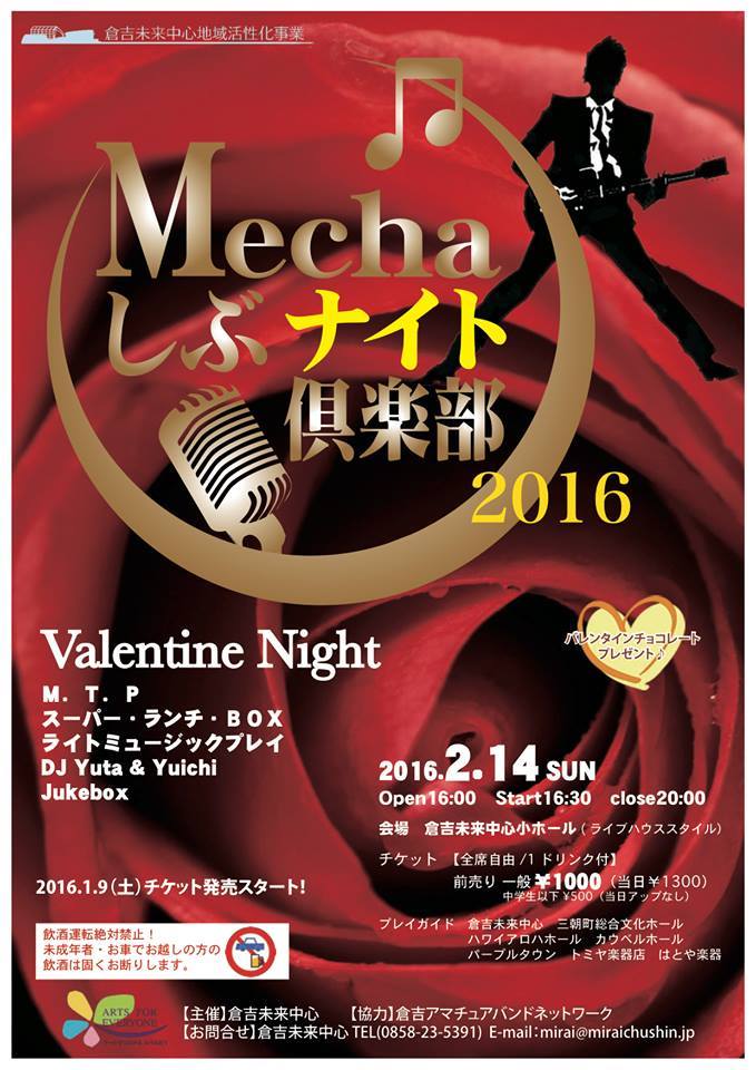 JUGEMテーマ:心、体、そして魂。 来る2月14日にDJ Yuta & Yuichiで、県立倉吉未来中心より委嘱を受けまして、"Mechaしぶナイト倶楽部2016"に出演致します。 この日はいわゆるバレンタインデーですね。私のようなイヤミったらしい人間がそのようなイベントに似つかわしいのかどうなのかという根源的な問題はさておき、受けた話は取り敢えず受けるみたいな。 ラインアップを見てみると、過去に私と何かしら関係があった方々の名前をちらほら拝見致しますね。良い悪いは別として。何せ狭い街ですからね〜。一悶着...