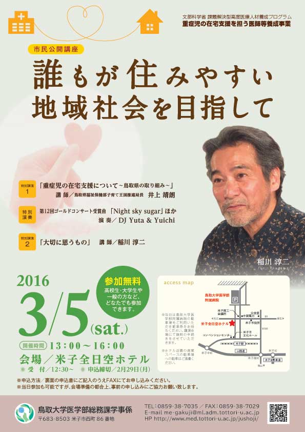 JUGEMテーマ:心、体、そして魂。 来る3月5日土曜日、鳥取大学医学部より委嘱を受けまして、文部科学省課題解決型高度医療人材育成プログラムの中の市民公開講座「誰もが住みやすい地域社会を目指して」にて、DJ Yuta & Yuichiで演奏致します。 詳細は以下のリンク先をご覧頂くとして、我々としては一番興味があるのは、かの稲川淳二さんとご一緒出来ることですね。何でもお子様が重度の障がいをお持ちだそうで、障がい者福祉に関する多彩なご活動をされていらっしゃるということです。そのような著名な方とご一緒出来るとい...