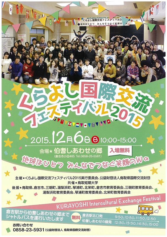 JUGEMテーマ:心、体、そして魂。 次の日曜日の12月6日、恒例のくらよし国際交流フェスティバルが、倉吉市内にあります「伯耆しあわせの郷」で行われます。 毎年楽しみにされているコアなファンの方がいらっしゃるようで、とても有難いことですね。メインは言うまでもなく、フードコートです。フランス・台湾・韓国・フィリピン・インドなど、この時だけ無国籍屋台村が出現します。まともに歩けないほど人がごった返すというのは、毎年のこととは言えこの辺では珍しい現象ではないでしょうか(笑)。フェスティバル自体は10時から...