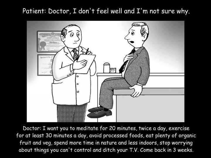 ネットサーフィンをしていたら、こんなものを見つけました。 リンク元へは画像をクリックすると飛びます。 患者;先生、なぜかわからないのですが、体調がすぐれません。 医師;瞑想を毎日二回20分と運動を30分行ってください。精製食品を避けて果物と野菜をたくさん食べるようにしてください。それから部屋に閉じこもらないで自然の中で過ごすようにしてください。また、あなたのコントロール下にないものについて気にしないように。テレビも見ないようにしてください。そして、3週間後に戻ってきてください。 &nbs...