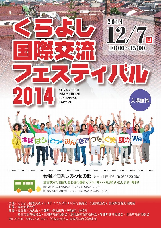 JUGEMテーマ:心、体、そして魂。 今週末12月7日日曜日午前10時より、倉吉市内の伯耆しあわせの郷におきまして、『くらよし国際交流フェスティバル2014』が開催されます。 今年も私は、パフォーマンス部門の責任者&DJとして参加しています。3回目なので慣れたものですが。 国際交流に関連する色々な団体が参加されるのですが、詳細はサイトをご覧頂くとして、今年個人的に興味があるのは、D-Day Projectさんの世界の即興音楽ですね。ご専門はアイルランドなのですが、そこに見られる即興演奏を中心に、様々な世界の即興演...