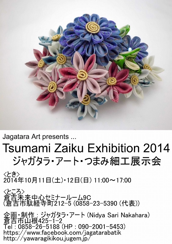 JUGEMテーマ:心、体、そして魂。 今週末11日(土)・12日(日)に、倉吉未来中心にて午前11時より午後5時まで、嫁さんのNidya Sariさんによりますつまみ細工の展示会を行います。 ちょうど紅葉の季節ですので、それに合わせたようなデザイン・色柄の作品を、多数展示する予定だそうです。 場所は、セミナールーム9Cです。手狭ですが、我々のような小規模な展示会には最適ではないかと。当日は、ここのところ大統領選挙のため若干政情不安定だったインドネシアよりようやく届きました例の『幻のコーヒー』や、手作りインドネシア...