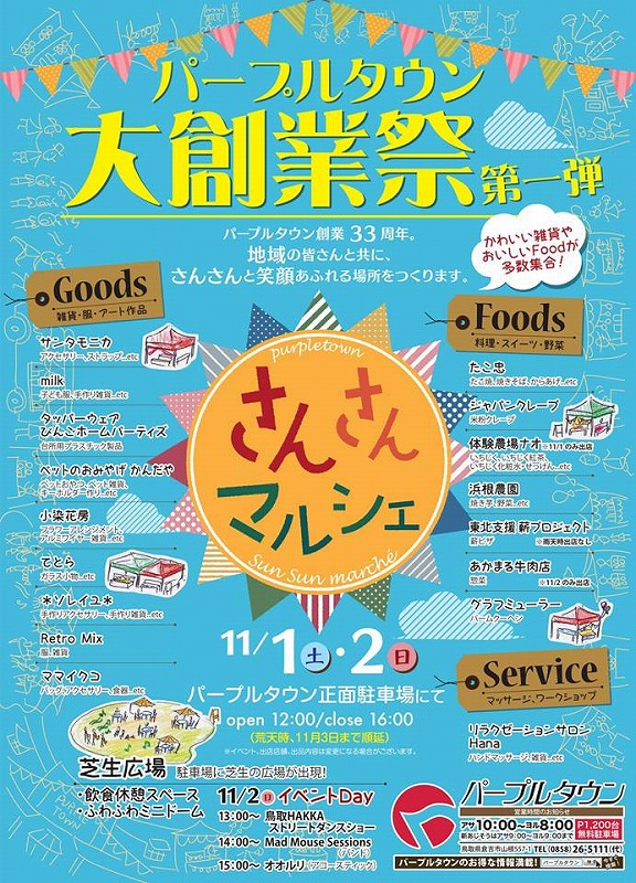 JUGEMテーマ:心、体、そして魂。 MMS名義で、二週続けてライヴを行います。 一つ目は、11月2日です。倉吉駅前にパープルタウンというショッピングモールがあるのですが、そちらが今年開店33周年ということで、それを記念して『さんさんマルシェ』というマーケット形式のイベントが行われることになり、そこで演奏させて頂くことになりました。 正面駐車場を開放して行われるかなり大規模なイベントのようです。企画室の植田さんはこのイベントを、県中部のショップやアーティストが集まってお互いに交流することが出来る定期...