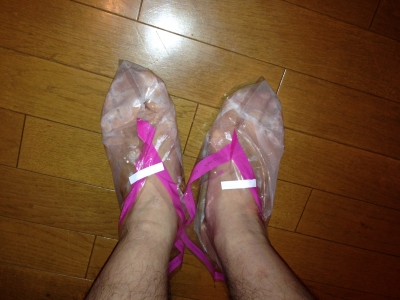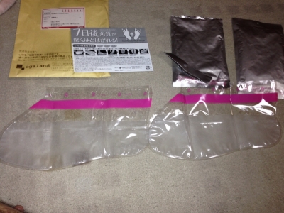 さて、そういえばパックの中身の紹介をまだしていませんでした パックの中身は・・・ 足袋が1足分入っていました。 不織布のような素材が足裏に・・・ そこにたっぷりの液体が入っています。 上の切り取り線にそって、ハサミでカットして、 足を入れる所を作ります。 液体がたっぷり入っているのがわかりますか?? この足袋に約1時間〜1時間半、足をいれて、ゆっくりと足を浸します。 匂いは3種類あるみたいですが、これは購入時に選択します。 ちなみに、私はローズを注文しました。 はさみ...