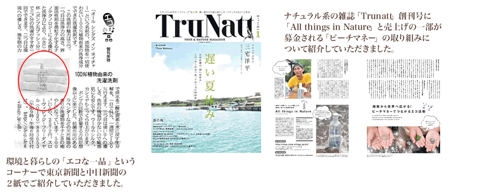JUGEMテーマ:オーガニック オーガニック洗剤「All things in Nature」は新聞や雑誌にも紹介されております。 今の時代”エコ”関連の商品は注目度が高く、このAll things in Natureはリン、蛍光剤、防腐剤を一切使用していないという点で、地球環境にとても優しい成分で作られているということから高く評価を受けているようです。 また、売り上げの一部がビーチマネー運動という海をきれいにしようという活動の活動資金に募金されており、商品購入事態がエコ活動につながる...