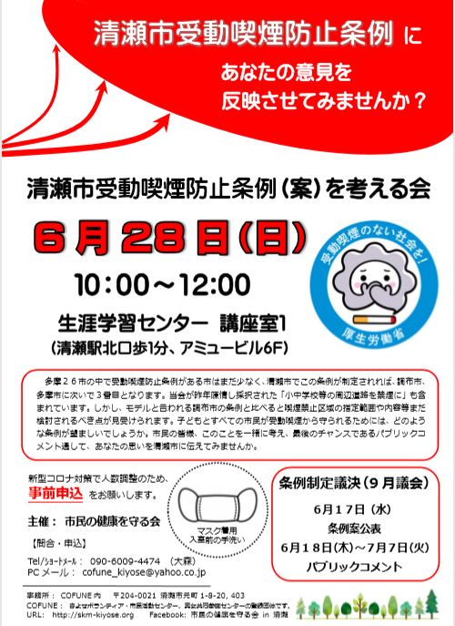 JUGEMテーマ:煙草による被害を無くすために 上記考える会で一緒に考えられなくとも、貴方の意見をパブリックコメントを通してお送りください。 ★6月18日(木)〜7月7日(火)パブリックコメント募集中です。 以下クリックし、「清瀬市受動喫煙防止条例の概要について」を是非ご覧ください。 清瀬市役所に例外規定を設けて、市役所敷地内の喫煙所を残す方針です。これは取り下げるべき内容です。 https://www.city.kiyose.lg.jp/…/030/040/140/20200610181755.…  ...