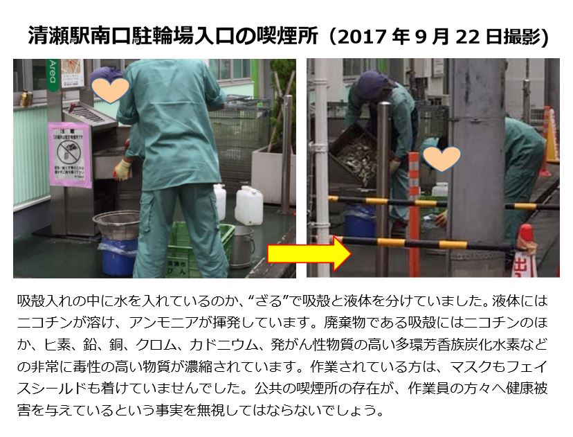 清瀬市公設の喫煙所の清掃が作業員に健康被害を与えているとしたら、あなたはどのように感じますか? 💛新型コロナに関連し、感染の危険を冒してゴミ回収をされている作業員の方々へお礼の手紙を書くことがマスコミで取り上げられ、多くの方々の賞賛をあびました。 喫煙所の清掃作業員の方々も同じです。新型コロナウイルスのついた唾液がタバコの吸殻に付着していたら・・・。しかし、このことは知っているかぎり残念ながらマスコミでは取り上げられませんでした。 💛7月7日(火)パブリックコメントの締切です...