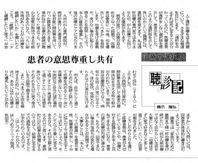 JUGEMテーマ:がん全般 3月23日患者の意思決定について、秋田魁新報に投稿しました。 以下本文。 人工透析治療を巡る問題について、さまざまな報道を目にします。「透析を中止すれば死に至ることが分かっているのに、医療者側が透析をしない選択肢を提示して、患者が死亡した。このような選択肢を示して良いのか」という論調には、違和感を覚えます。私は透析治療の専門家ではありませんが、がん治療でも同じような場面があります。 病気が進行し治癒が見込めなくなった段階で、医療者...