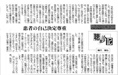 JUGEMテーマ:がん全般 秋田魁新報の医療コラム「聴診記」 今回も患者の意思決定について書いてみました。 昭和から平成、令和へと時代の変遷とともに変化していきました。 以下本文 令和の時代が始まりました。昭和の終わりに医師になった私は、平成の30年間を医師として過ごしてきました。平成は、医療が大きく進歩した時代でもありました。 手術後の輸血が原因で母が罹患したC型肝炎は、かつて「非A非B型肝炎」と呼ばれていました。やがてC型肝炎ウィルスが同定され、治療法の目覚ましい進歩によ...