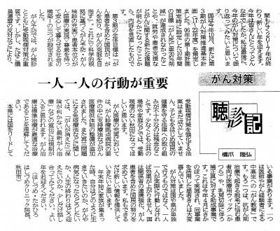 JUGEMテーマ:がん全般 平成29年12月30日秋田魁新報「聴診記」 本年のがん対策についてコメントを投稿しました。 以下全文です。 がん対策 一人一人の行動重要 間もなく2017年が終わり、新しい年を迎えます。今年は皆さんにとってどんな年でしたか。私は最後に、今年のがん対策について振り返ってみたいと思います。 国は今年10月、新たに第3期がん対策推進基本計画(17〜22年度)を策定しました。06年の第1期計画策定時に設定した10年間の目標「がん死亡率20%削減」が達成されなかっ...