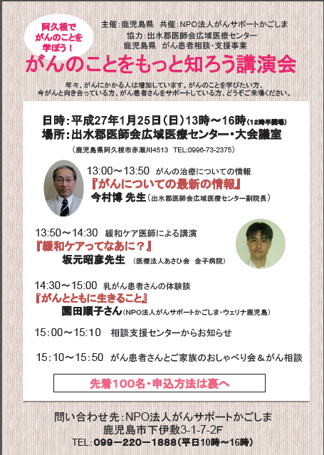 毎年恒例のがん患者・相談支援事業での講演会の開催です。 主催:鹿児島県 共催:NPO法人がんサポートかごしま 日時:平成26年12月6日(土)13時〜16時(12時半開場) 場 所 :そお生き生き健康センター・大会議室 (曽於市末吉町二之方2342−2 TEL:0986-76-5353) 人数:先着100名 13:00〜13:30 乳がん患者さんの体験談 『がんとともに生きること』 堂薗いずみさん (NPO法人がんサポートかごしま事務局) 13:30〜14:30 がんの情報を探すには? 『地域のがん情報の探し方...