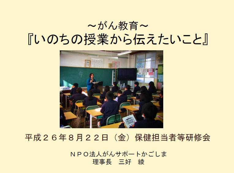 昨日23日(土)に、鹿児島市の保健担当者等研修会にて 「いのちの授業から伝えたいこと」というお話をさせて頂きました。 市内の保健体育教育に携わる、保健の先生や体育の先生の 集まりです。今年から始まる「がん教育」のモデル事業のこともあり、 念願のお話をする機会を頂戴しました。 三好から、「がん教育」の国や各都道府県の動きについて、 鹿児島で取り組んできた「いのちの授業」の報告、 これからの展望についてお話をさせて頂きました。 最後の質疑応答の時間には、昨年度実施させていただいた学校の ...