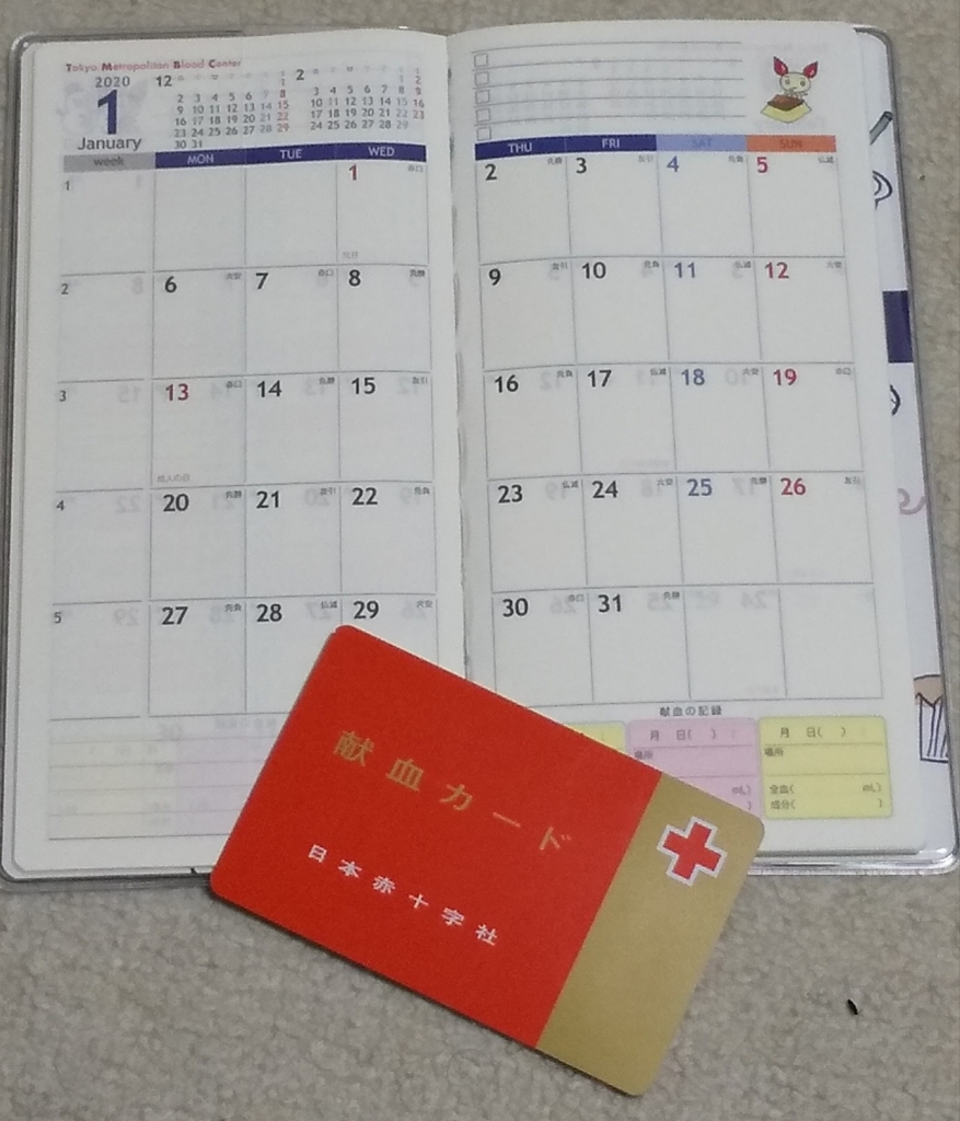 いつもの通りのビルの3Fに献血ルームがあった。 ふと立ち寄ったのが最初で、40才くらいから始めて今では年2回のイベントとなっています。 きっかけは、ちょっとした社会貢献でしょうか。 なかなかボランティアなどは時間の制約もあり困難ですが、献血であれば自分で予定がたてられます。 年2回する理由は、11月に献血すると翌年の手帳か卓上カレンダーがもらえます。 その手帳は、とても使いやすく見やすいので、毎年これ目当てに行っているようなものです。 400mlは、数か月間隔をあけるので...