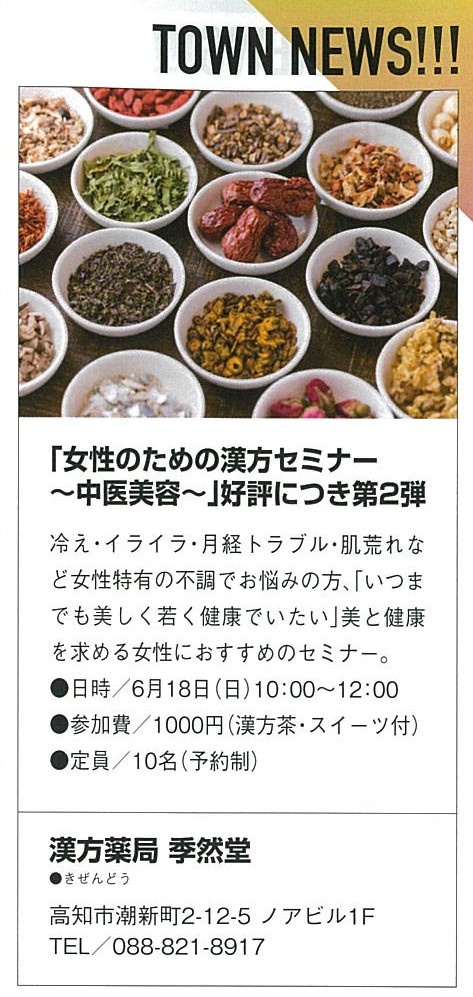 JUGEMテーマ:漢方 こんにちは 気がつけば5月も終わりますね。 雨が好きで梅雨が待ち遠しい、雨女の漢方薬剤師、谷季里子です さて、前回のブログで予告しました漢方セミナーの告知です またこの度も『ほっとこうち』6月号に掲載していただきました。 発売から3日で7名様からご連絡を頂戴し、定員まであと3名様となりました やはりここでも『ほっとこうち』さんの影響力の大きさを感じます。 定員になり次第、締め切らせていただきますので、参加...