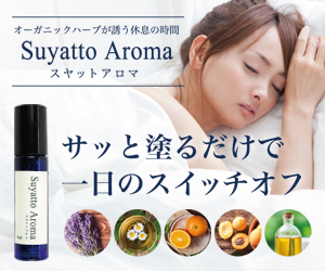 JUGEMテーマ:不眠/過眠 紹介するのは不眠でお悩みの方にオーガニックハーブの休息ロールオンアロマ【Suyatto Aroma】 ぐっすり休みたい方のロールオンアロマ【Suyattoアロマ】 オーガニックハーブが誘う休息の時間 さっと塗るだけで一日のスイッチオフ! 「リラックス」や「休息」に働きかける香り 嗅覚だけが大脳辺緑系へ直接届く スヤットアロマの3つのポイント リラックスや休息の働きかける香りオーガニックハーブの力 こだわりのオーガニックハーブオイル使用 簡単! さ...