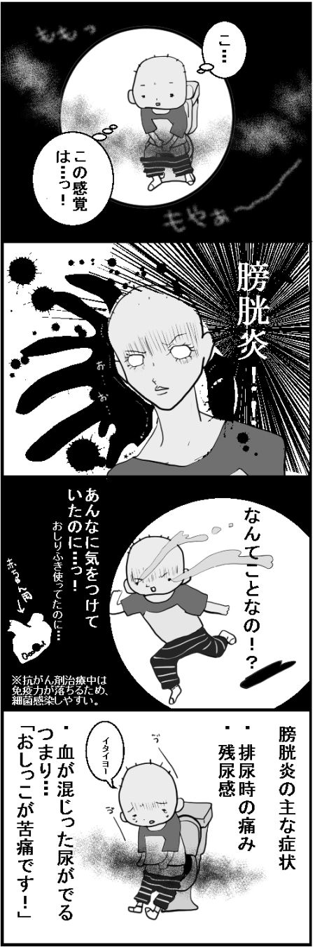 JUGEMテーマ:女性の病気 こんにちは!ぶーぶです。 4月から仕事に復帰して、毎日刺激がいっぱいのなかなか楽しい毎日を送ってます。 最後の抗がん剤投薬が去年の10月だったのですが、なんだかもう遠い昔のようです。 モンチッチのような珍妙な髪型も、すっかり見慣れてしまいました でもでも、早く地毛ライフに戻りたいなぁ。 さて、今日は抗がん剤中に起きたトラブルについて書いてみました。 それは抗がん剤(AC)投薬後、24日目にして起こりました。 いつものようにトイレで用を足そうとしたその瞬間、見覚え...