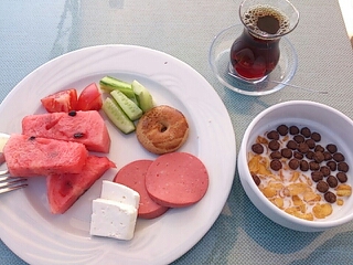 気球に乗らなくてもいいかな〜なんて思ってたけど宿の人に勧められ思わず。 今回の旅、観光の一発目がカッパドキアにて気球。 <朝-1> 気球ツアー会社での朝食 パウンドケーキみたいなの。パン、いちご 、バナナ、スイカ、メロン うん?日本と変わらないフルーツ。 <朝-2> 戻ってきてホテルのテラスで朝食。 きゅうり トマト スイカ ハム チーズ クッキー なんか早すぎたみたいでパンがまだ無かった。 ...