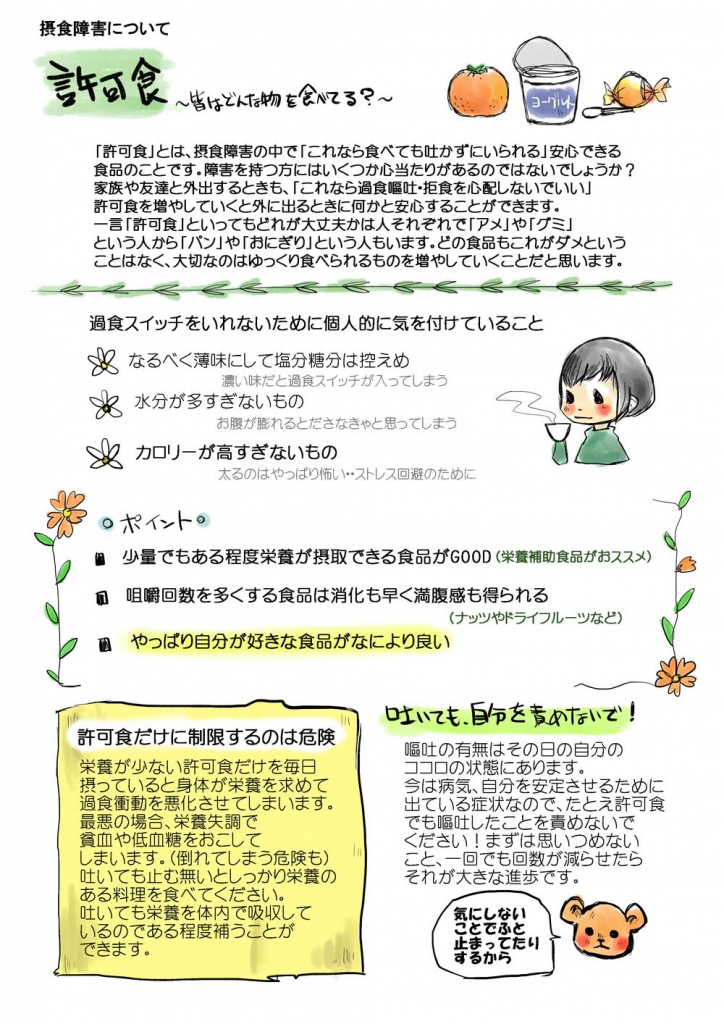 JUGEMテーマ:躁鬱・適応障害・強迫性障害・摂食障害・対人恐怖症 etc 許可食について認識したのは病気になって1、2年経ってからでした。当時は飴やラムネが精いっぱいでした。 流石に十数年経つとチーズ、豆腐、ヨーグルト、グラノーラなどだんだん増やせていますが 量も栄養もとても正常なものではなく、嘔吐をせざるを得なくても食べなければまともに日常生活を送れません。 でも幼少時からの極度の肥満体といい、振り返ってみると生まれてこの方正常に食事を摂れてなかったと思い 善し悪...