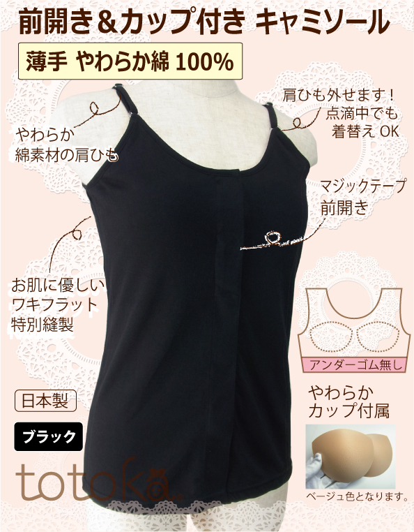 入院準備 乳がん術後 介護に カップ付き 前開き ワンタッチ肌着 キャミソール トトカオリジナル 見頃・肩ひもが綿100%のお肌に優しいタイプのカップ付きキャミソールの薄手タイプです。 肩ひも化繊テープが苦手な方の為に、本体と同様の綿100%の生地で肩ひもを作りました。 また、左右前身ごろ側から肩ひもの片側が外れますので点滴をしたまま着替える事もできます。 点滴をしていますと着替えたい時に看護師さんをその都度呼ばなければなければならず不便ですが、こちらのキャミソールであれば点滴を外したり...
