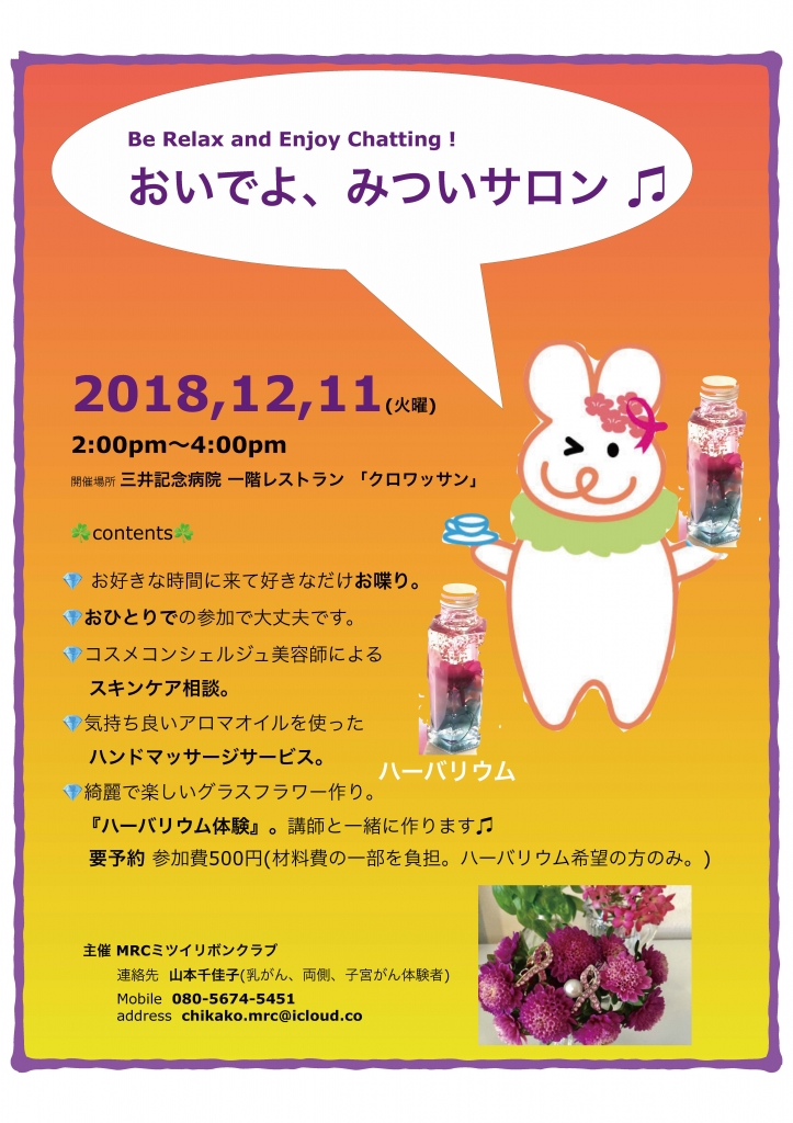 2018.12.11(火) PM2:00〜4:00 おいでよ、みついサロン♪ 乳がん患者さま同士のおしゃべりとワークショップの会 開催! JUGEMテーマ:乳がん・乳癌・乳ガン 【場所】三井記念病院1階レストラン『クロワッサン』 【日時】2018.12.11(火) PM2:00〜4:00 【内容】下記の広告をご覧ください。 <お問い合わせ> MRC代表 山本 Phone:080-5674-5451 E-mail:chikako.mrc@icloud.com ※お問い合わせの際は「トトカのホームページを見て」とお伝えい...