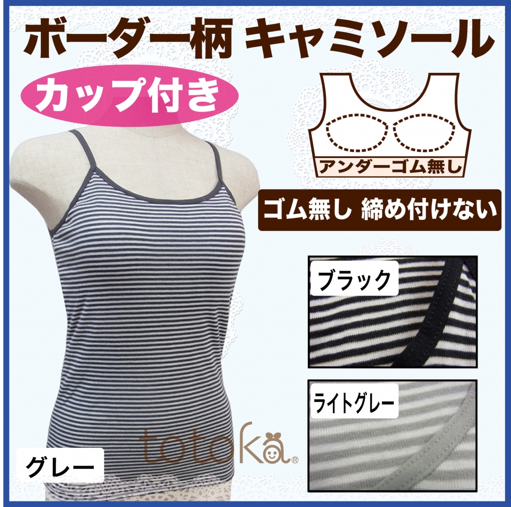 新発売!カップ付きキャミソール アンダー ゴム無し 締め付けない ボーダー柄 商品ページはこちら⇒ JUGEMテーマ:レディースインナー JUGEMテーマ:乳がん・乳癌・乳ガン 商品ページはこちら⇒ 付属のカップは取り外しができます。 また、アンダーバストの締め付け感もありません。 ※仕入れメーカーの都合により、付属カップの柔らかさやカーブが変わることがありますので予めご了承願います。 こちらのキャミソールのアンダーバスト部分...