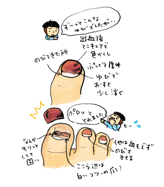 JUGEMテーマ:乳がん・乳癌・乳ガン 以前足の親指から出血して、 ずっと少し浮いたような形になってた爪ですが… とうとう剥がれました。 見た目的には厳しいけど、思ったよりは痛くないです。 出血した頃の方が痛かった…。 指の半分くらいまでそこから新しい爪がのびたらしく、 剥がれた後は、固い変形した爪と新しい普通っぽい爪が短く生えていました。 いつかポロッととれますよと先生がいってたけど、「これか」という感じ。 右側だけ剥がれ、左はま...