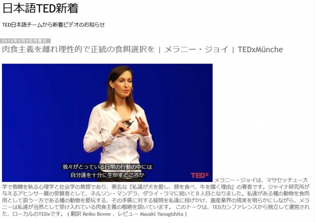 JUGEMテーマ:乳がん・乳癌・乳ガン JUGEMテーマ:健康 日本語TED新着 TED日本語チームから新着ビデオのお知らせ 先日、興味深い記事に出会いました。 動画を見て感銘を受けましたので、 書き下ろしてみました。 動画には目を背けたくなるような場面があるからです。 その時間帯を表示しましたので、勇気のあるときに見て下さい。 私達はなぜ? 「肉食」を 「普通・自然・必要」と思っていたのでしょうか? その疑問...