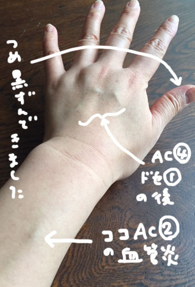 JUGEMテーマ:乳がん・乳癌・乳ガン 今朝lから、左手をグーにすると痛い気がします。 AC④とドセ①の抗がん剤は手の甲から点滴でした。 直後に痛みはなかったものの、連続したせいか血管が弱ってるのかもしれません。 AC②の時にダイレクトに痛かった血管炎も 結局まだ残っていて、黒っぽい血管のままです。 少し盛り上がってるような…前程の痛みは無いけれど。 毎回看護師さんには時間をかけて点滴場所を探ってもらってるのですが 血...