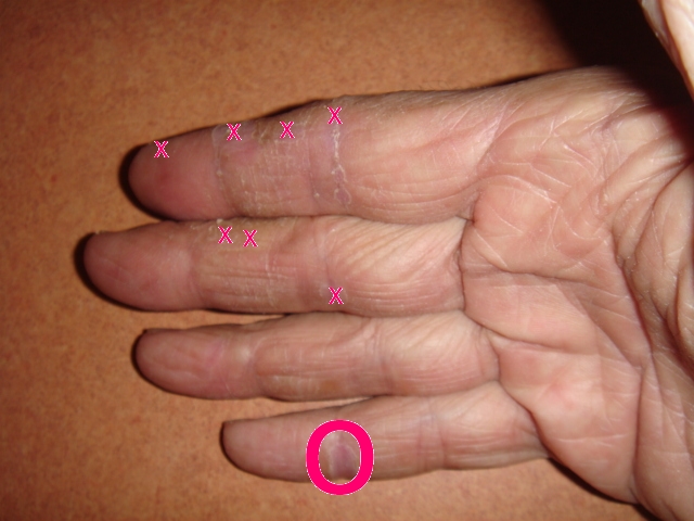 抗がんを一時中断して約1週間。 本来なら 手足の痺れ出血 とかの副作用が出て来る時なのだけど どうも凄い肌の修正能力が発揮されているみたい。癌が大半を占める肝臓機能は落ちている筈だけど・・・ なぜか 鼻とか口の横にあった出血が綺麗になくなって アカギレの様にパッカリ割れてた 手の傷もアレ???と思うくらい早く治った。 人間土壇場に来たら 特殊能力を発揮するんか?? アンマリ グロなので写真は取っていないのだけど 右手の今の状態。Xの所はひび割れで出血していた所 O...