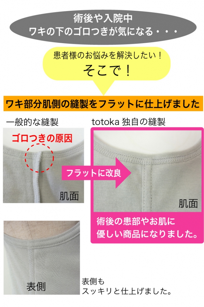 JUGEMテーマ:乳がん・乳癌・乳ガン 『術後に脇の縫製が傷に当たって痛い・・・』 そんな患者様の声から、トトカのオリジナル商品(前開きキャミソール・タンクトップ・肌着)は脇の縫製がフラットになっています! 前開きカップ付きキャミソール 前開きカップ付きタンクトップ 前開きカップ付き肌着