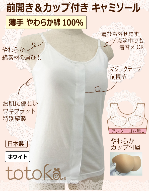 JUGEMテーマ:乳がん・乳癌・乳ガン 入院・術後・介護に 薄手やわらかホワイト 前開きワンタッチ肌着キャミソール【優しい肩ひも&ワキフラット】トトカオリジナル ペコ様 おすすめ度: S−Mサイズ購入 普段SかMです。サイズはちょうど良かったです。 入院用に全色かいました。生地が薄くてパジャマの下に着るのにちょうど良い感じです。付属カップが柔らかく胸を覆ってくれるので安心できました。 あえてリボンや...