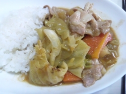 JUGEMテーマ:糖尿病と向き合う 昼食に、スープの素を使って「 チーズカレー 」を、作りました。 キャベツ・にんじん・ジャガイモ・しめじ・タマネギ・ウインナー・豚肉等々。 具だくさんに、しました。 昨日の残りの「 タラのカレー味 」も、そろえて。 こっちは、ケチャップをかけました。