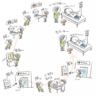 前回のサイクルで、初日の"点滴による抗がん剤"をしたのは入院中だったので、通いで点滴を受けるのは今回がお初。 10時枠からの診察予定、その前に採血があるので1時間前の9時に病院到着。採血を済ませて待ち、診察に呼ばれたのは11時半。そりゃそうです患者さんが沢山だもの。毎回人で溢れる病院で"2人に1人がガンになる時代"というフレーズを思い出していました。 先生の問診を受けて状態を把握してもらって初めてその日の点滴(抗がん剤)の容量も決まるので、そこから更に1時間以上の点滴準備時間が必要...