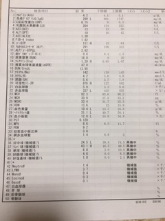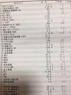 11月6日 11時から診察なので一時間前に採血を終わらせます。 検査結果です。L、Hが見えますが少しのオーバー、不足です。 ただ、IL−2Rが1324とHです。基準値が127〜582です。 IL−2Rで悪性リンパ腫の診断の補助および治療効果判定する。 この数字は腎機能が低下していると上がるので、私の場合はそれに起因。 2週間前、IL−2Rが1600でしたが画像診断でも問題なし。 今回も数字が下がっているので気にすること...