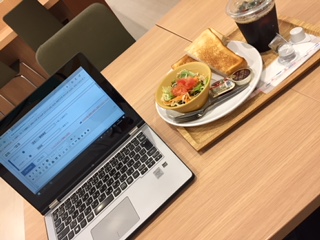 6月6日 退院になりました。予想より1日早い、順調です。 一週間後には8回目の入院になりますが、 外の空気は気持ちよいです。 昨日も体調が良いので、一日中、仕事できました。 一階のカフェにてモーニングを頂きながら、ブログ。