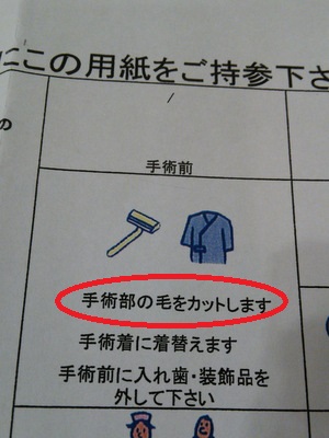 朝です。とうとう手術の日がやってきましたよ。隣に入院しているオッサンの爆音いびきに悩まされ、ティッシュを丸めて耳に突っ込んだ姿で看護師さんに起こされました。朝食&昼食にはありつけず、水分摂取も11:00でストップ。後は手術が始まるのを待つのみです。 さて、手術にあたって憂鬱だったのがコレですよ。 むう。患部はもじゃもじゃしたところなので、そりゃそうしなければダメでしょうけど。それにしたってぺろっとポール君を出したまま看護師さんに剃り剃りされるなんて、なーんか屈辱的。昨日病室に案内してくれた...