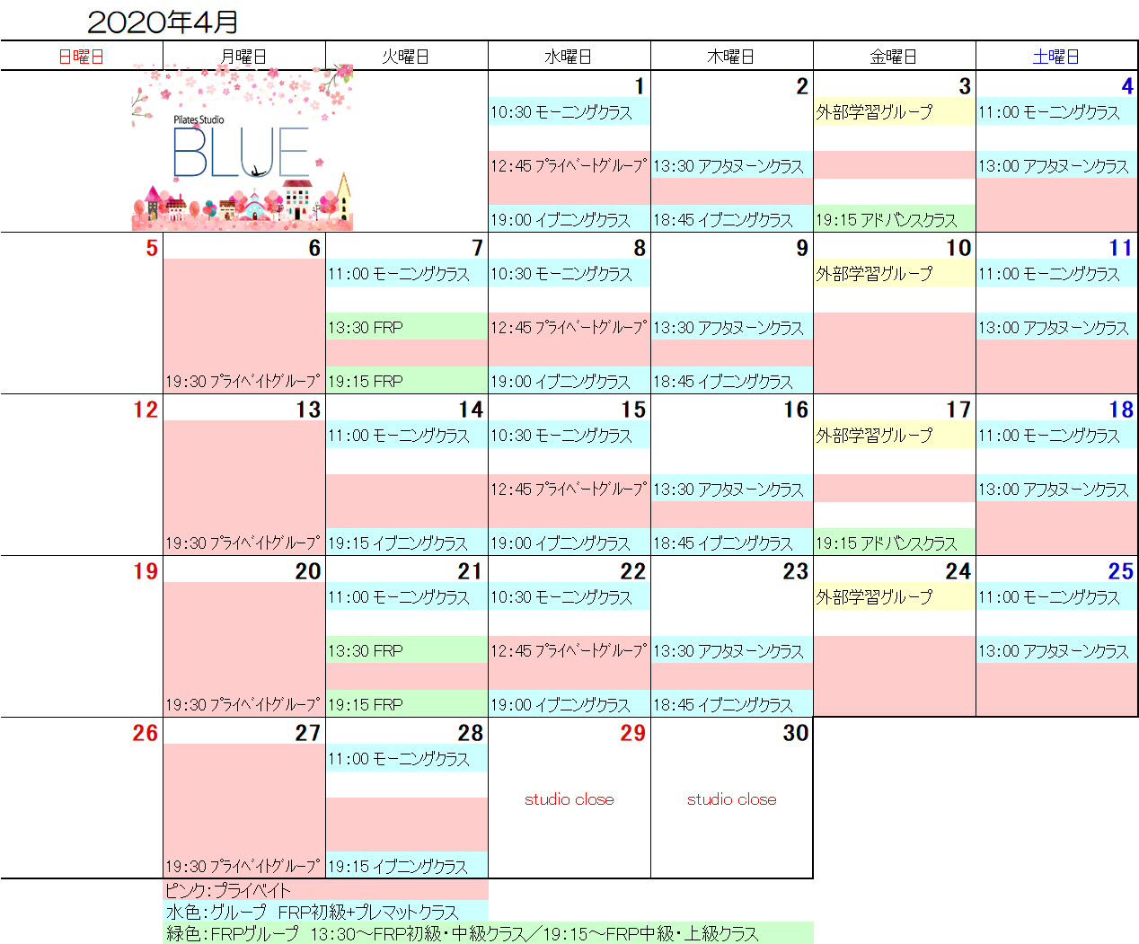 JUGEMテーマ:Pilatis (ピラティス) お待たせいたしました〜! マネージャー・クーピー作 春爛漫!BLUE再開4月のレッスンスケジュールをアップいたします。 Studio BLUEでは換気等衛生面に最善の注意と努力をして4月よりレッスン再開する予定です。(今のところ) ※会員の皆さまにはあらためて3月最終週にご連絡をいたします。 レッスン受講の際は体調申告システムにご理解とご協力をお願いいたします。 ・少しでも風邪の症状がみられる場合はレッスン参加をご遠...