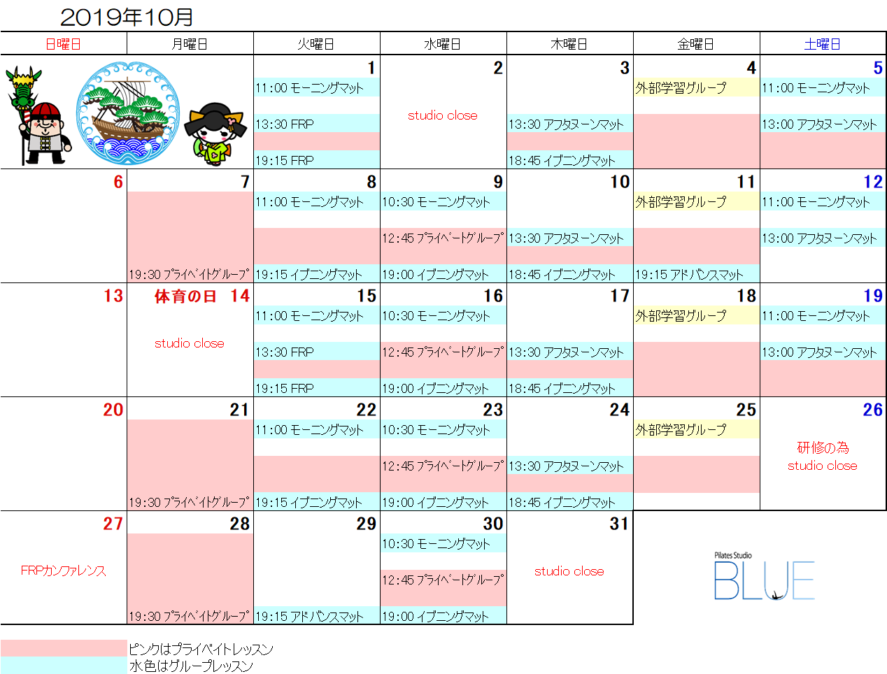 JUGEMテーマ:Pilatis (ピラティス) いよいよ明日からおくんちですね〜! 今年は3日間とも平日なので庭先回り追っかけができそうにないですが(笑)、BLUEに各踊町が来てくださるのをワクワクしながら待とうと思います。 10月・11月のBLUEでのレッスンスケジュールをアップいたします♪ ↑ ボジョレーヌーボーでほろ酔いの動物シリーズもお楽しみください(笑) またクラス名は改名していないのですが、これから...