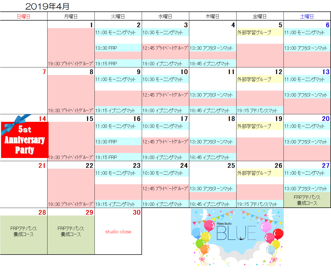 JUGEMテーマ:Pilatis (ピラティス) 4月のレッスンスケジュールをアップしそびれておりました〜。 いよいよ4月13日(日)BLUE5周年パーティが近づいてまいりました! スペシャルゲストとして声楽家・内夏美さんのミニコンサートもございます。 そして嬉しいことにスタジオ最年少会員さんの可愛いバレリーナさんにも踊っていただけることになりました! 楽しみ〜!!!(ご参加お申込みがまだの方ぜひ!!!) 5月のスケジュール表はただいま作成中です...