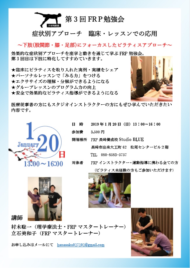 JUGEMテーマ:Pilatis (ピラティス) 年末にしては暖かい日が続いています。寒暖の差に気をつけて過ごしたいですね。 年明けの1月20日(日)はStudio BLUEにて「第3回FRP勉強会」を開催いたします。 今回は下肢(股関節・膝・足部)に特化したピラティスアプローチです。 ピラティスを臨床に取り入れた実績、スタジオレッスンでの取り組みなどをFRP長崎養成校マスタートレーナーコンビで お伝えしていきます。FRPインストラクターの方はもちろんのこと、他団体のインストラクターの方、まだピラテ...