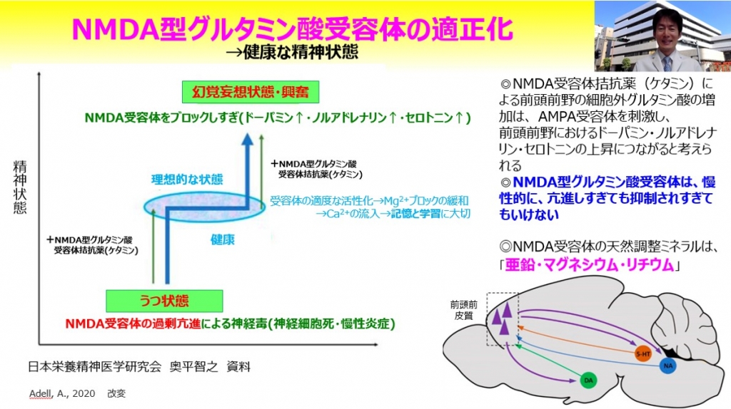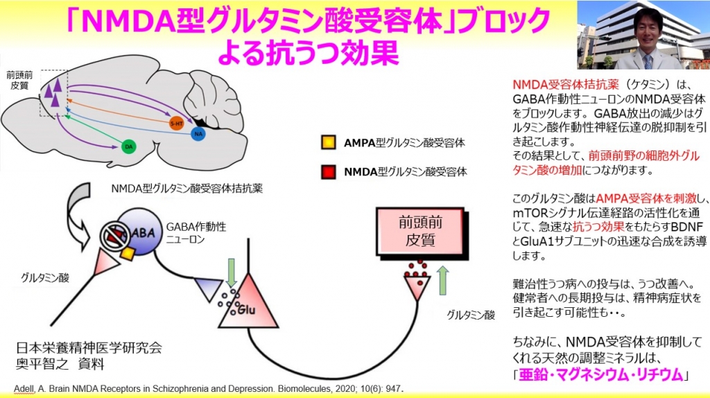 JUGEMテーマ:精神医学(psychiatry) https://www.dr-okudaira.com/post/nmda-type_glutamate_receptor ◎NMDA受容体拮抗薬(ケタミン)による前頭前野の細胞外グルタミン酸の増加は、 AMPA受容体を刺激し、 前頭前野におけるドーパミン・ノルアドレナリン・セロトニンの上昇につながると考えられます ◎NMDA型グルタミン酸受容体は、慢性的に、亢進しすぎても抑制されすぎてもいけない ◎NMDA受容体の天然調整ミネラルは、「亜鉛・マグネシウム・リチウム」 ※ケタミンは統合失調...