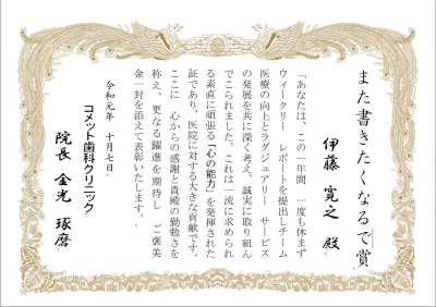 JUGEMテーマ:日記・一般 JUGEMテーマ:歯科 ウイクリーレポートという名のノートをスタッフ全員が持っていて、 毎週、月曜日の朝に提出されます。 ・1週間の間にあった事で感謝したい事(人)。 ・1週間の間に書かれたブログ「副院長の奮闘記」の中から選んで感想を書く。 ・その他、何でもいいので1週間の間に思った事など・・・。 ・宿題が出た時はその答えを書く。 以上の内容で1年間パーフェクトに提出した人に 「また書きたくなるで賞」表彰状と金一封(1万円)が贈られます。 技工...