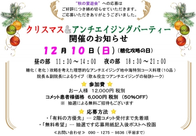JUGEMテーマ:幸せなお金と時間の使い方 JUGEMテーマ:健康 JUGEMテーマ:歯科 明日12月10日はXmasパーティです。 食事会(パーティ)の目的は、歯に問題をかかえ三度のお食事が美味しく頂けなかった、 また果物やお菓子も食べることに不自由だった患者様が、症状が改善し 再び取り戻すことが出来た食べる喜びを最高級のお料理で”美味しく楽しく”過ごしていただくのが目的です。 今回のお食事のテーマは「アンチエイジング・糖化攻略」です。その内容はパー...