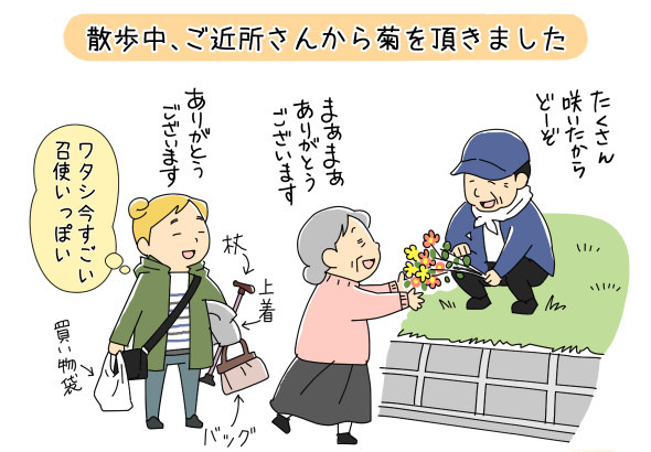 JUGEMテーマ:介護 母江さんは私以外の人と話す時、よそ行きの声になります。 電話の第一声が別人声になるという 「はい、○○でござぁます」 ↑コレですw 一生懸命良い印象を与えようと笑顔で対応してるんだと思います。 多分とても脳に良いんですが、一生懸命やり過ぎて疲れちゃうんですよね。 人当たりはいいからデイサービス向いてるのに、本人は疲れるので今は行けていない状態。 いつか行けるといいねぇ。 頂いた菊の花を母江さんの机に置きました。い...
