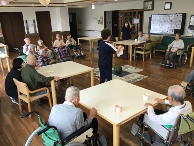 JUGEMテーマ:社会福祉 今年の梅雨時期は大変な大雨災害と未だに止まない新型コロナウイルスとの戦いで新しい生活スタイルを模索している中、今回は、特別養護老人ホーム六尾の郷での楽しいひと時を皆様にご紹介します。 感染症予防対策の中、利用者様の生活スタイルも変わり三密を避ける為、誕生日会等のイベント自粛が続き、ご家族との面会にもご協力とご不自由をお掛けしています。 少しでも、利用者様に笑顔になって頂きたく今回の「スイカ割り」を企画しました!! 実はこの大きな大...