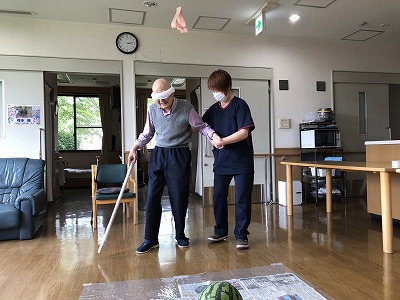 JUGEMテーマ:社会福祉 みなさんこんにちは!暑い日が続いていますね。 そんな中、T様の家族様よりスイカ一玉頂きました! 「スイカ割りしたいなぁ」と思ったのですが、頂き物なので切ってお出ししようと思っていると、家族様より「スイカ割りしてな!!」とのお言葉を頂き… 早速、その日の午後にスイカ割りをしました! もちろん、T様に割っていただきます! 棒の先端でスイカの場所を探りながら、職員の声を頼りに大きく振り下ろし割る事ができま...
