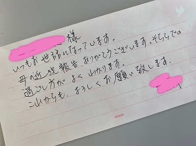 JUGEMテーマ:社会福祉 みなさんこんにちは。 先日T主任よりブログにて紹介をして頂きました。初めて自分の紹介をしてもらい、恥ずかしながらとても嬉しく思いました。 さて、7月の始めに家族様宛に送らせて頂いた近況報告のお手紙。到着すると共にたくさんのお礼のお言葉、お電話、お手紙を頂きました。 H様からは「あっとほーむ六尾の郷での母の様子がとてもよく分かりました」、N様からは「コロナ対応で大変な中、本当にありがとうございます」、Y様からは「読んでいて涙が出て...